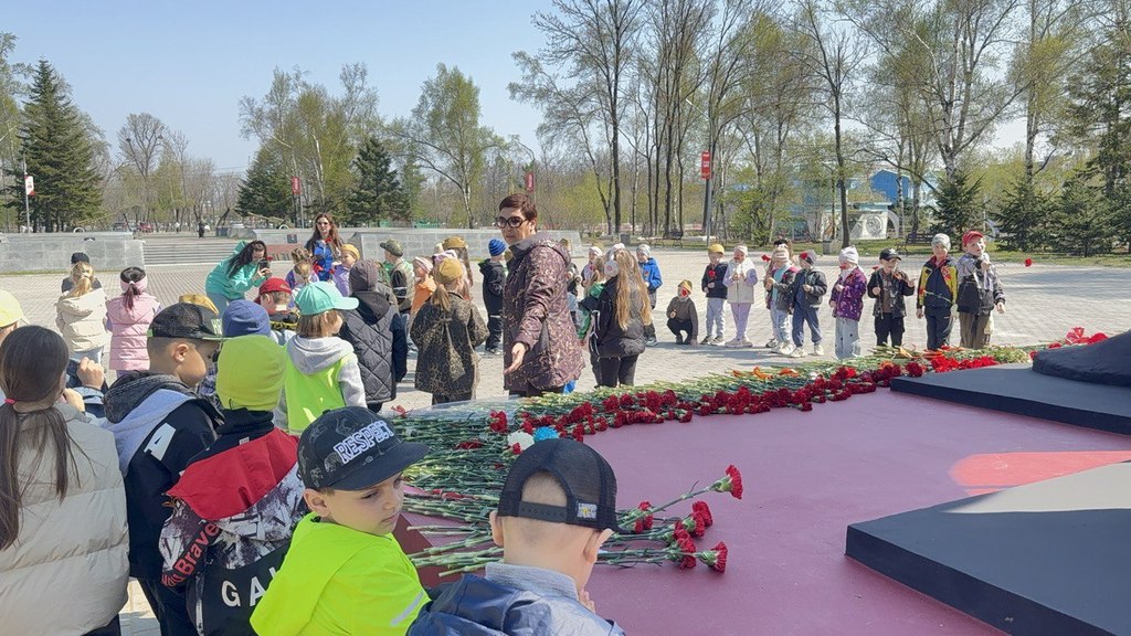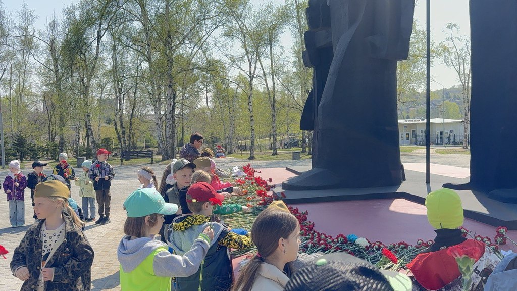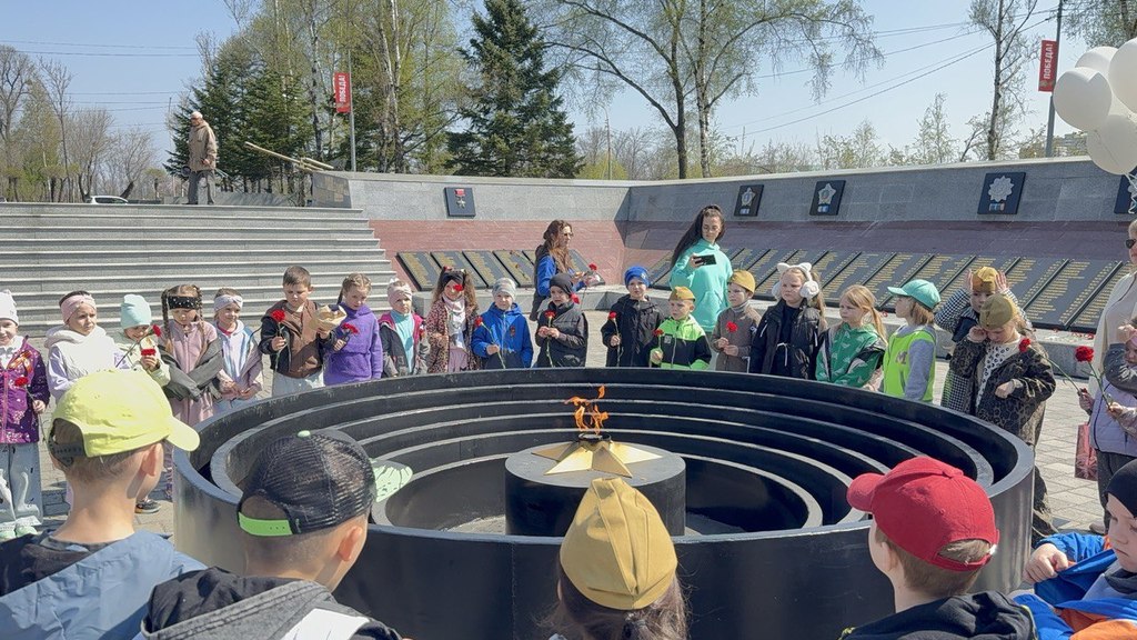 У Вечного огня в торжественной обстановке дети почтили минутой молчания героев, возложили цветы к мемориалу Воинам-артемовцам, прочитали стихи и исполнили песни.